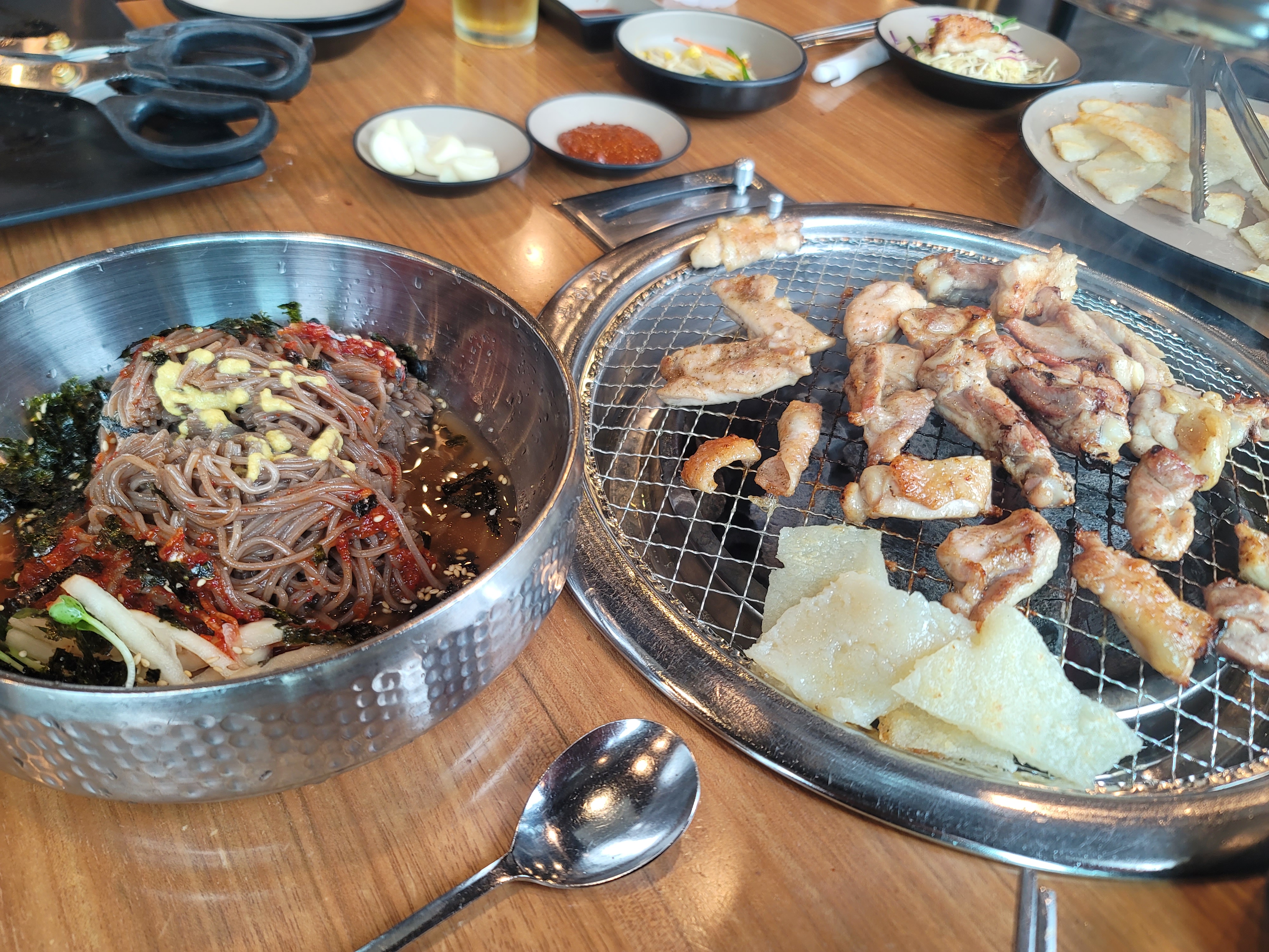 🔥 소금닭갈비는 불향과 쫄깃한 식감이 살아 있어 고기 좋아하시는 분들께 추천드려요. 양도 넉넉해서 1인분도 꽤 푸짐하답니다.          감자전은 바삭한 겉과 촉촉한 속이 조화를 이루며, 막국수는 닭갈비의 느끼함을 말끔히 잡아줘요.