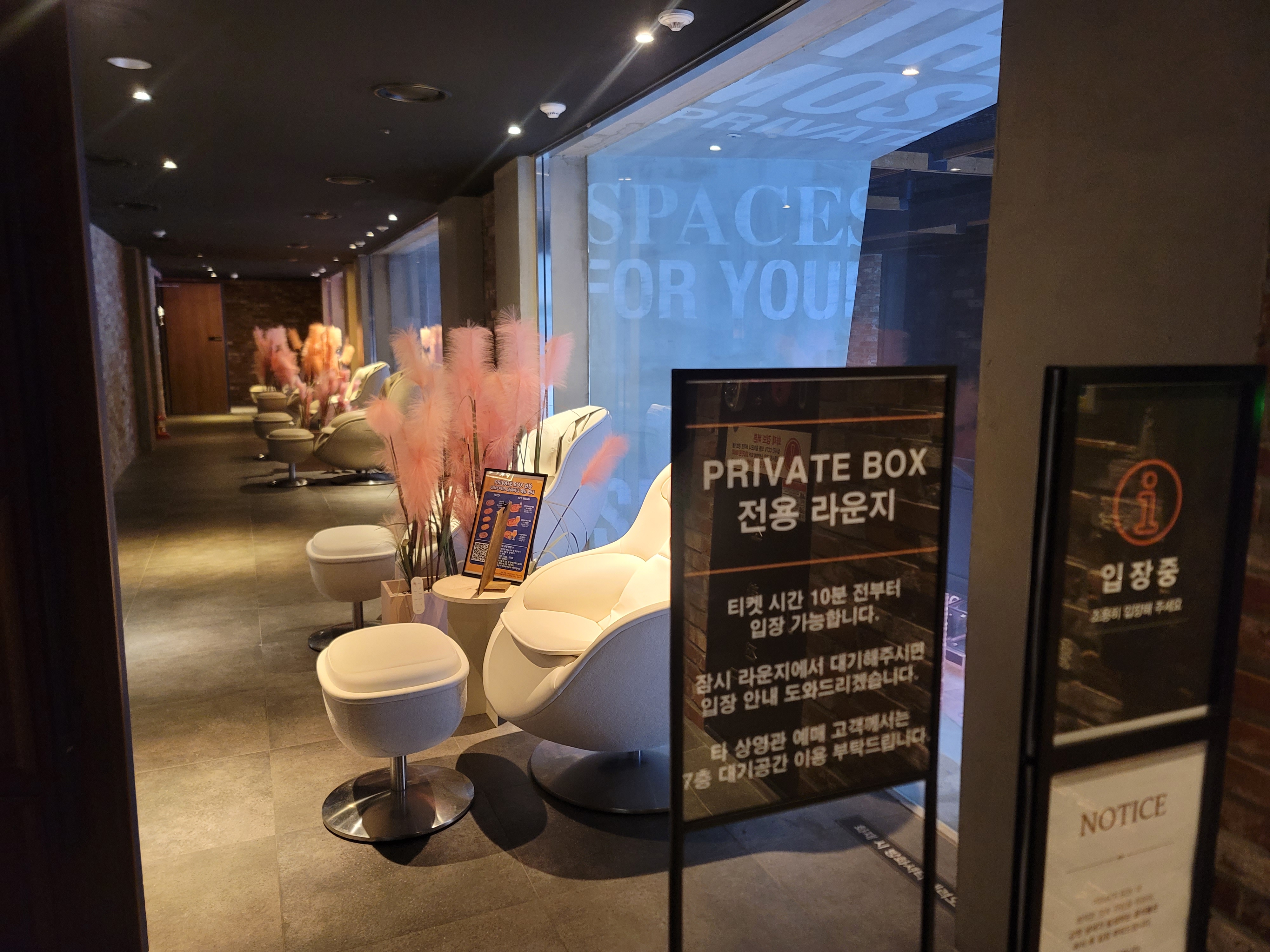 🛗  프라이빗 박스는 전용 엘리베이터를 타고 8층까지 올라가야만 하는데, 프라이빗 박스 이용객만 사용할 수 있도록 입장부터 남다른 프라이빗함을 느낄 수 있습니다. 8층에 내리면 넓은 라운지와 함께 두 개의 상영관(라이브러리, 리빙룸 컨셉)이 마련되어 있죠.