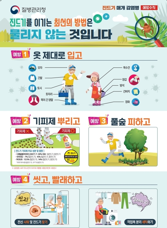 | 활동 중 | · 진드기 기피제 주기적 사용·풀밭 덤불 등 진드기 서식지 오래 머무르지 않기 · 풀밭에 앉을 때 돗자리 사용 |