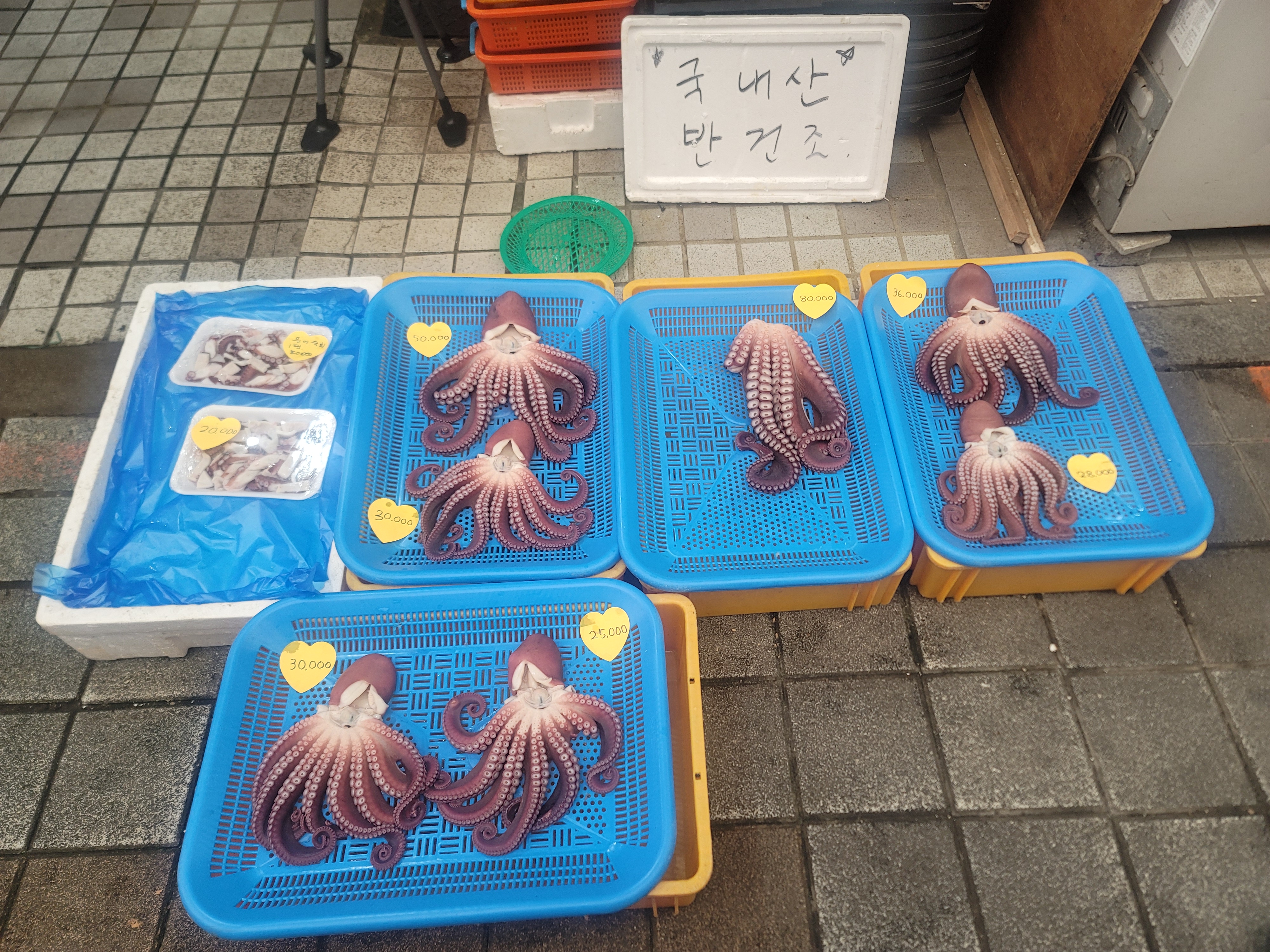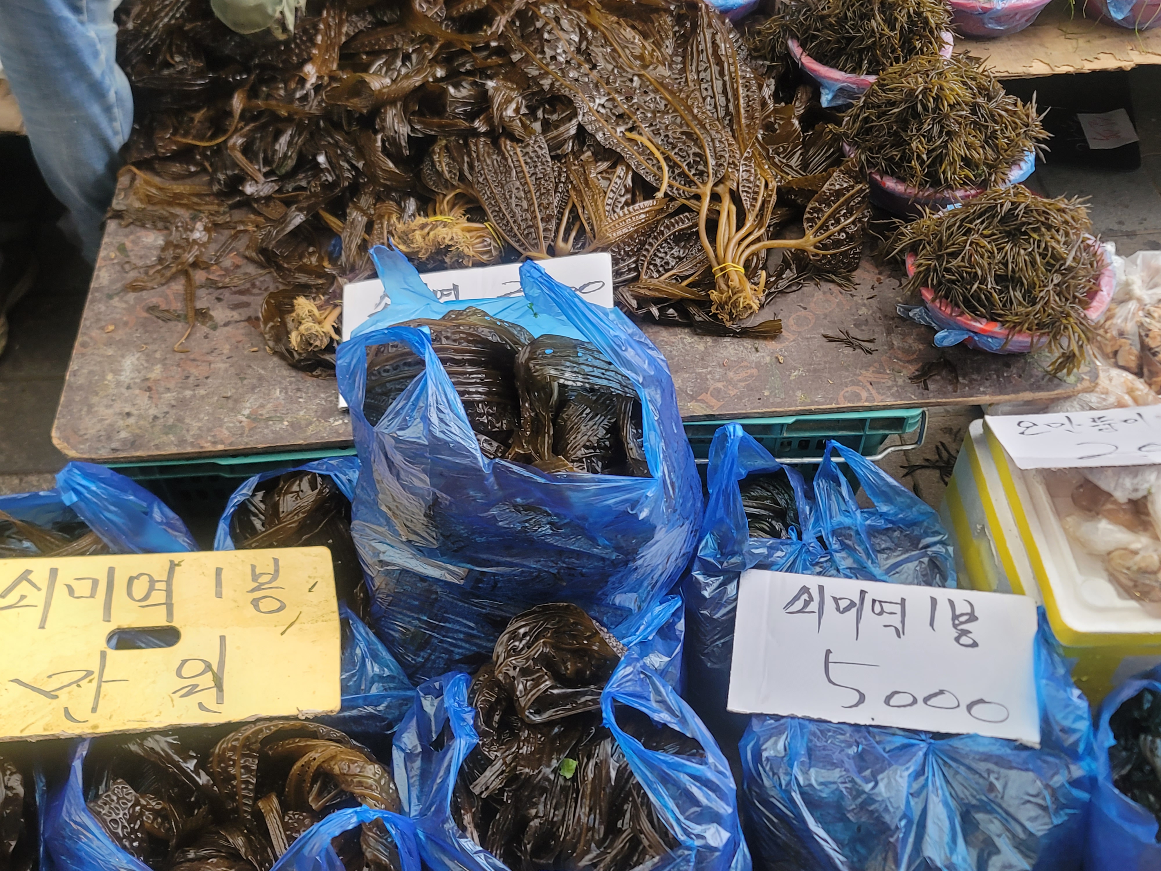 싱싱한 오징어, 문어, 가자미 등 바닷가 시장답게 생선의 질이 매우 좋고, 무엇보다도 가격이 착해요. 횟감도 바로 구매 가능하고, 근처 식당에서 손질 서비스도 제공됩니다.