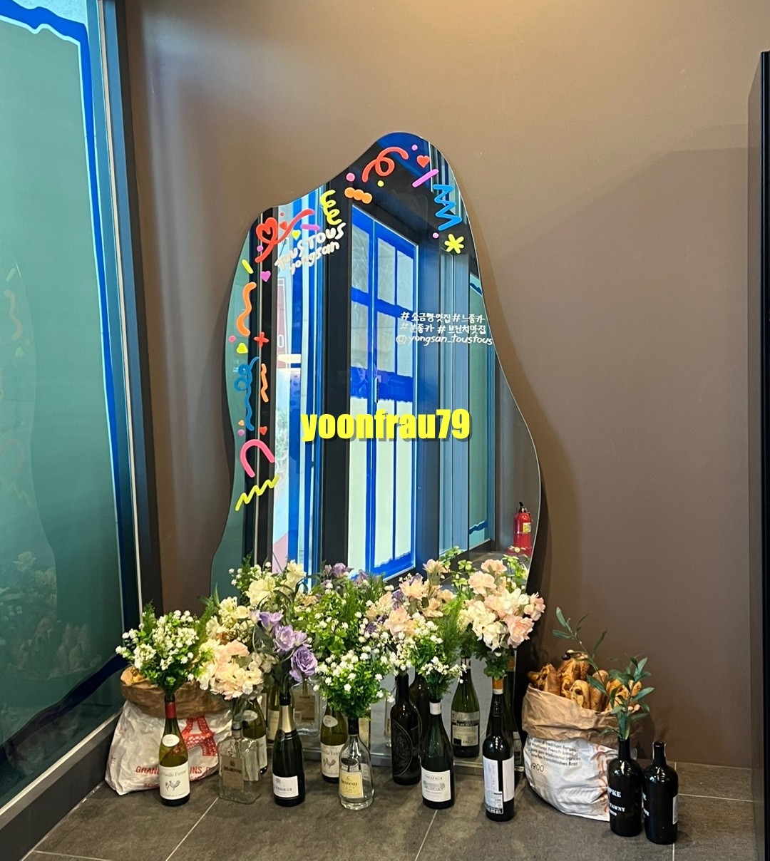 자연 채광 덕분에 사진 찍기에도 굿 📸✨ 입구에 놓인 큰 거울 앞에 꽃들이 화사해서 한컷 찍어봤습니다.