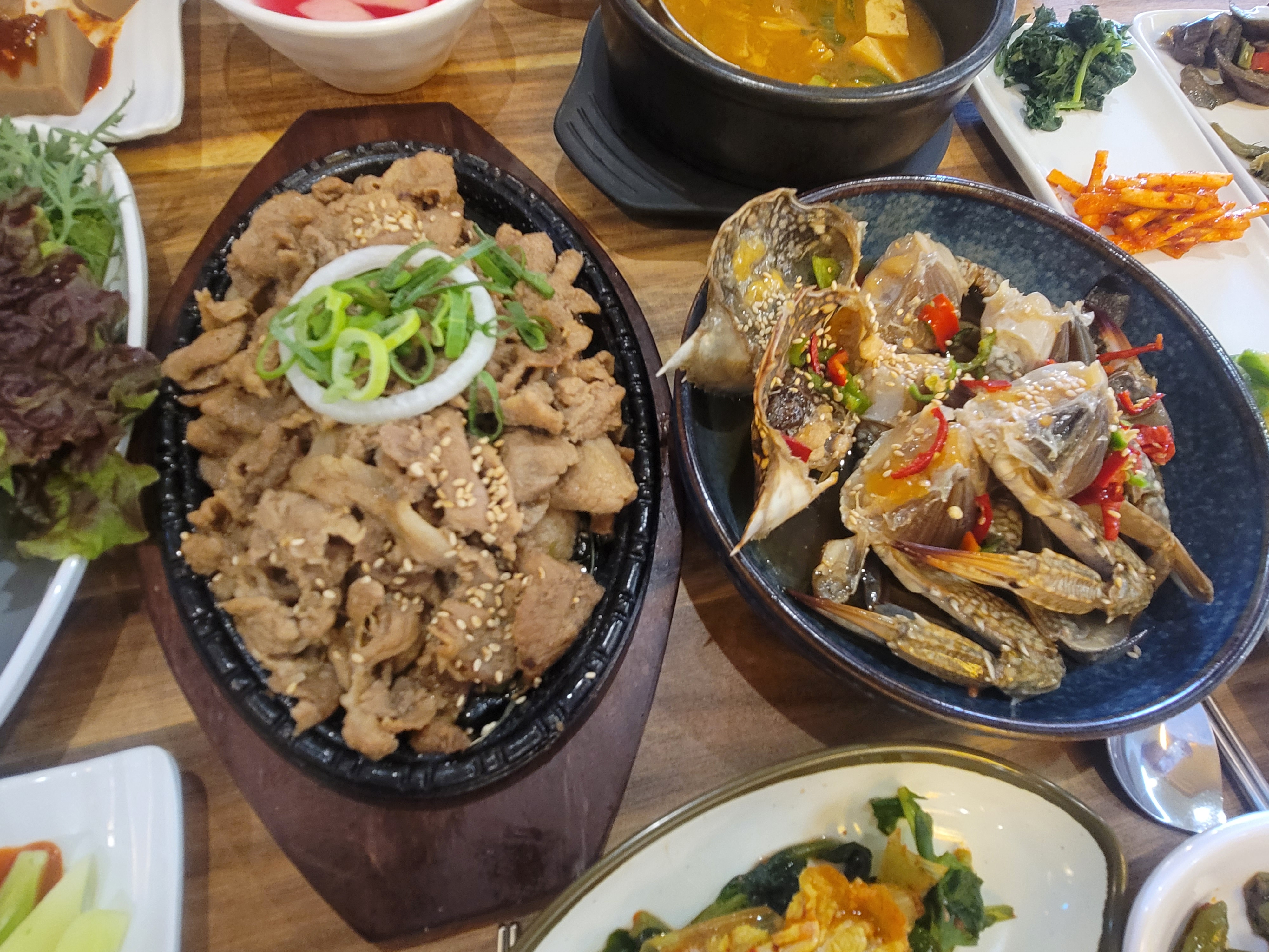 간장게장, 솥밥, 된장찌개, 계절 나물, 잡채, 김치전, 샐러드 등 15첩 반상 |