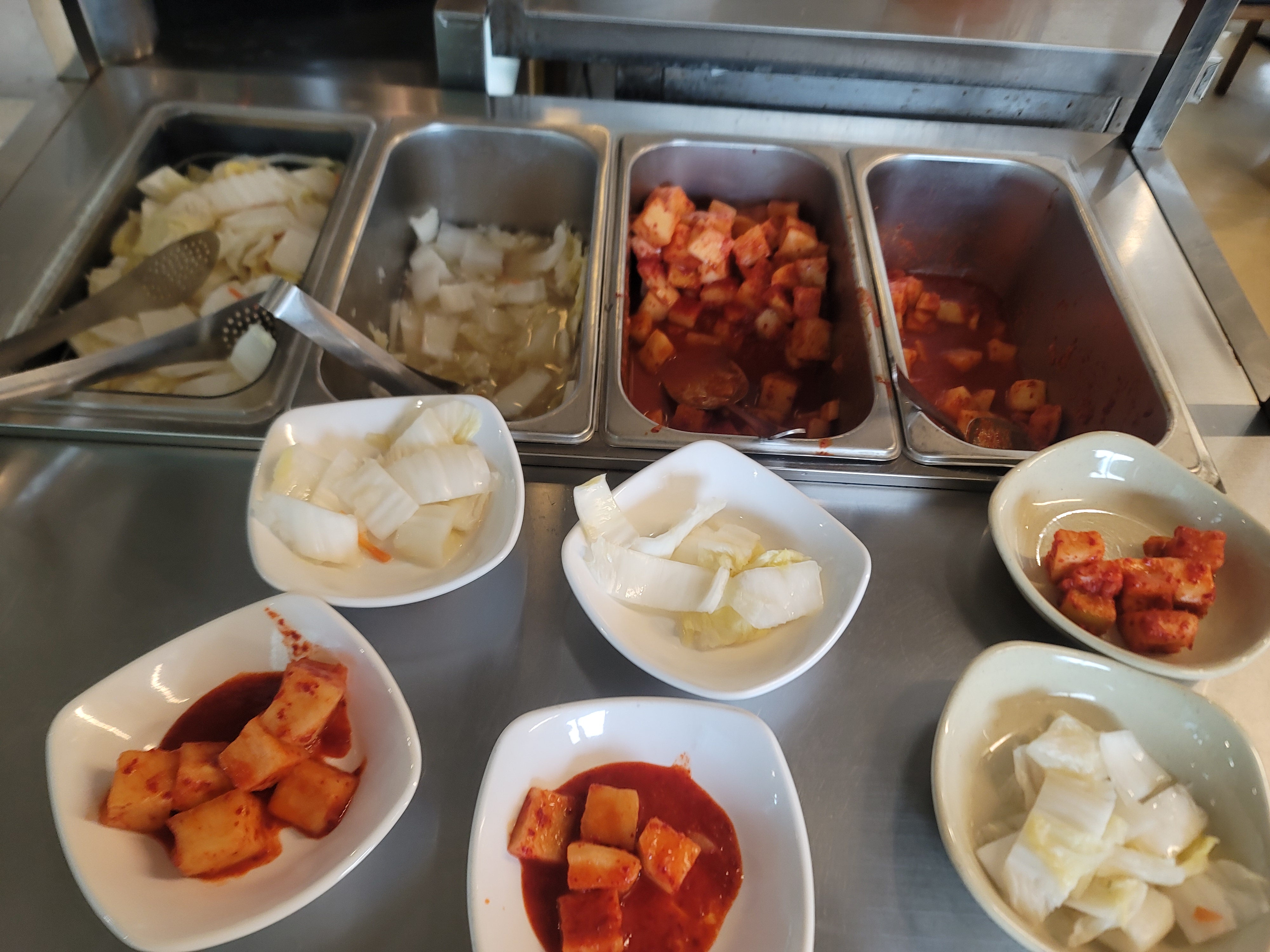 - 셀프바가 운영되며, 백김치, 야채, 공깃밥, 접시, 육수 등 비치되어 있습니다.