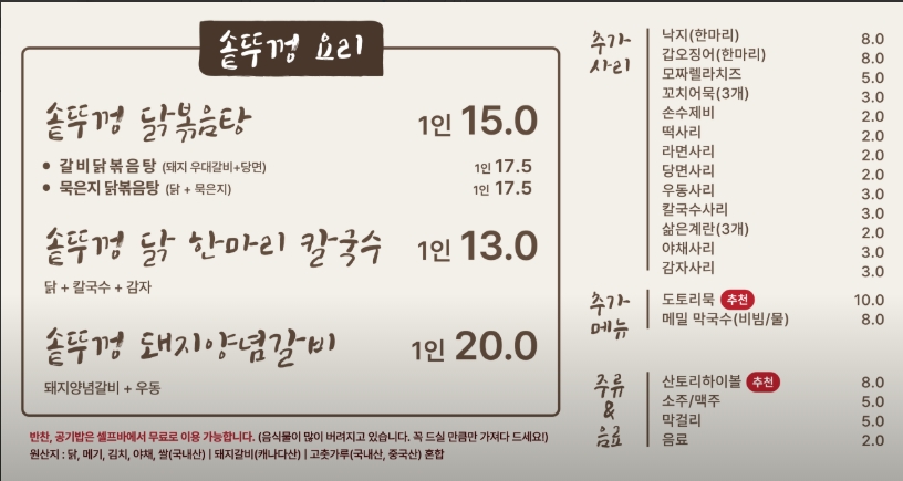 - 솥뚜껑이 테이블당 하나라 닭볶음탕, 닭 한 마리 칼국수, 돼지양념갈비 중 하나만 선택 가능합니다.